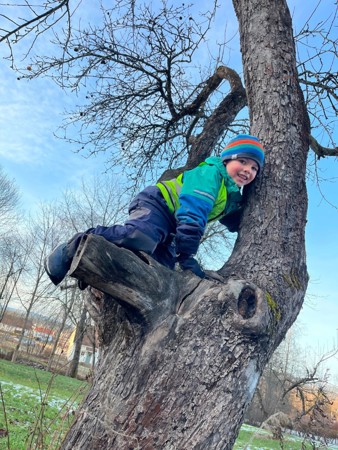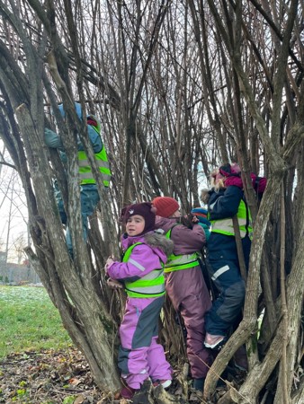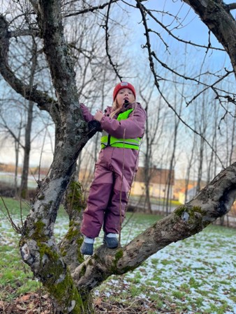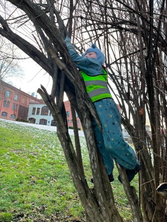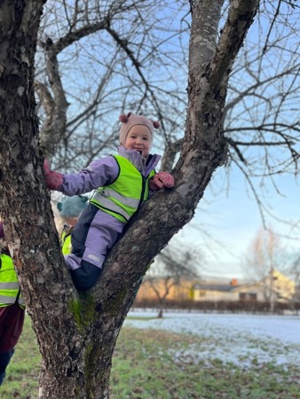 I Møllefossen er vi opptatt av å la barna klare ufordringer på egne premisser, og når de ønsker å komme seg opp i et tre- ja da klatrer de helt selv. :-)